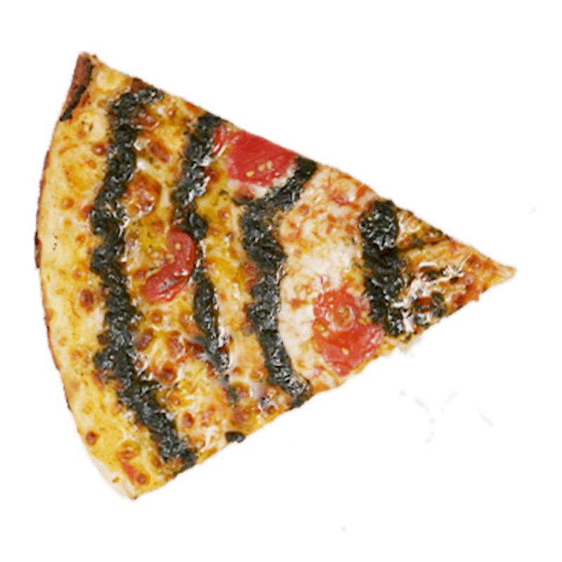 Özel pizza sosu, mozzarella, sotelenmiş tavuk parçaları, pesto