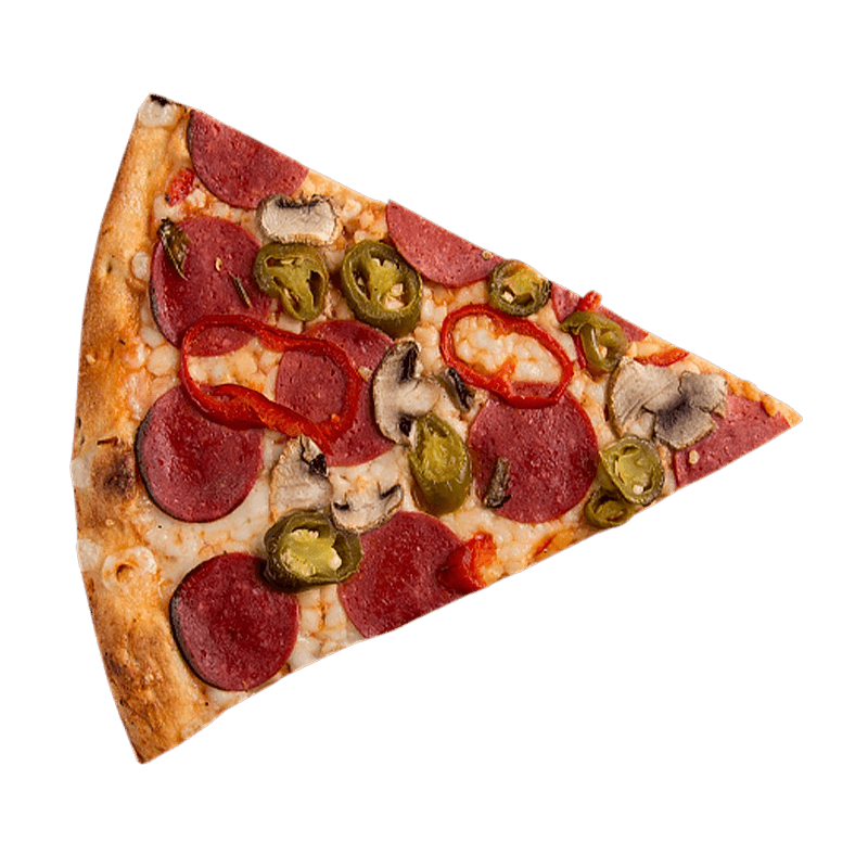 Özel pizza sosu, mozzarella, sucuk, mantar, jalepeno turşu, kırmızı biber